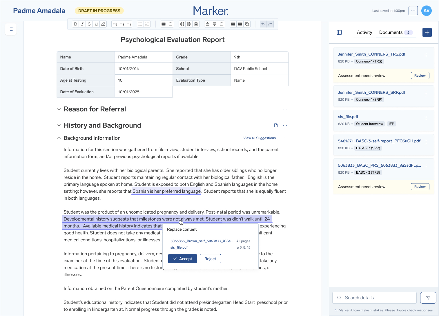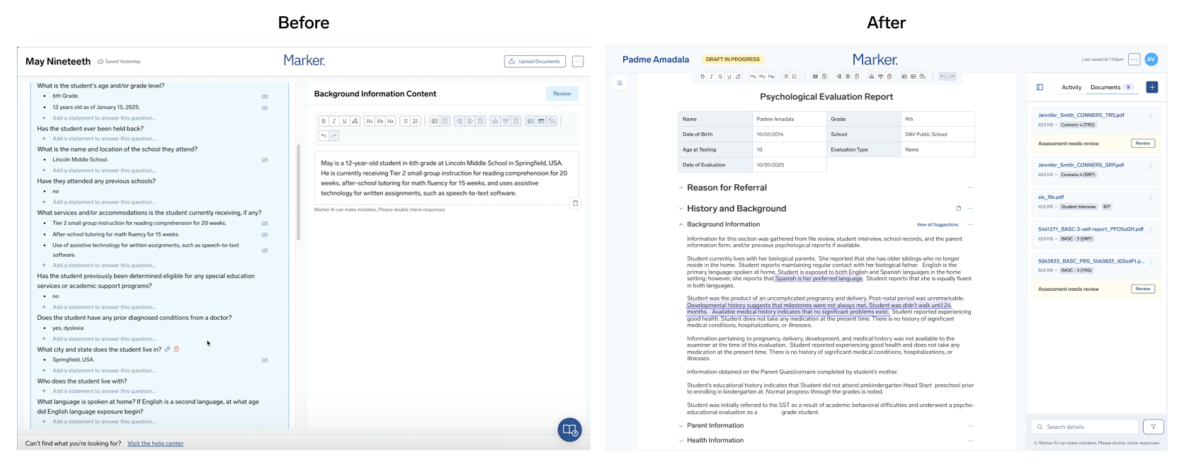 We partnered with Marker Learning to redesign the student psychoeducational evaluation report workflow and implement new AI-powered features that significantly improved usability, client satisfaction, and product adoption.