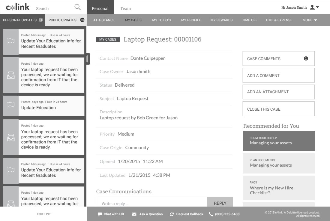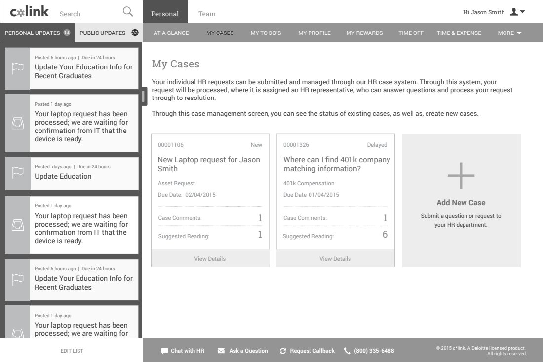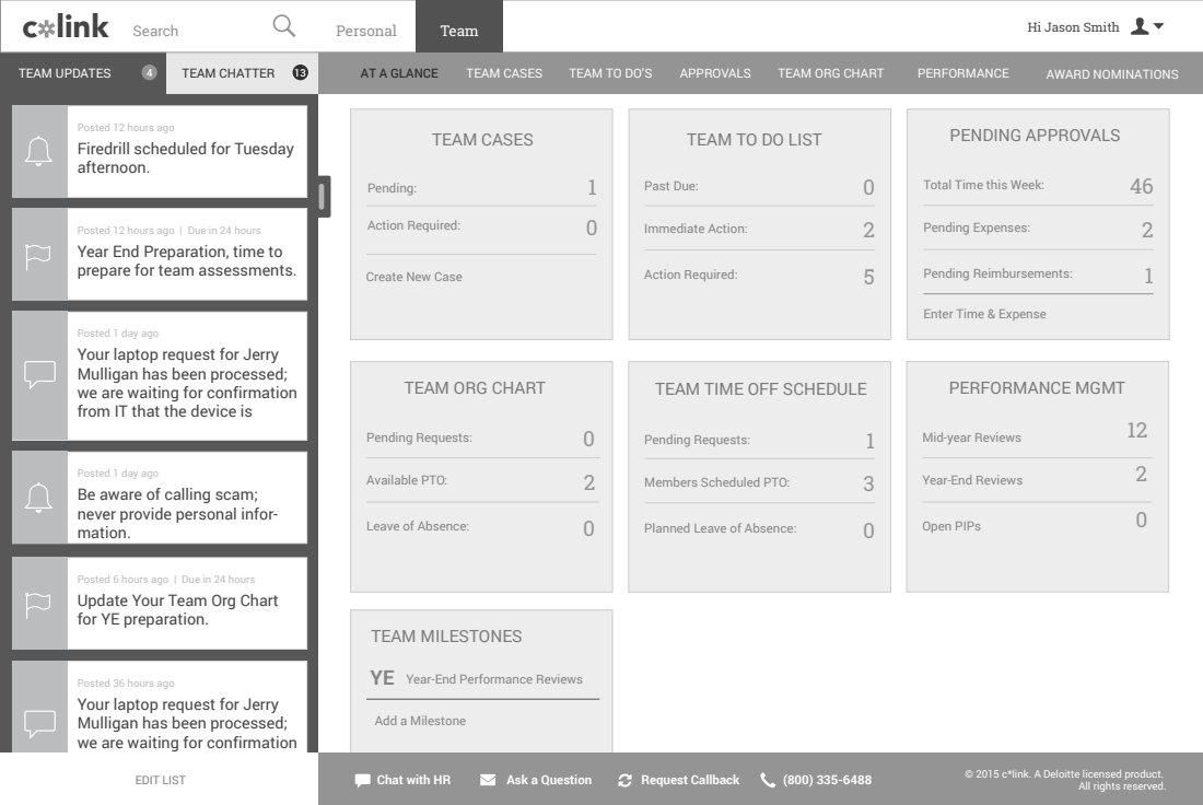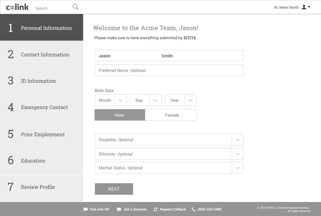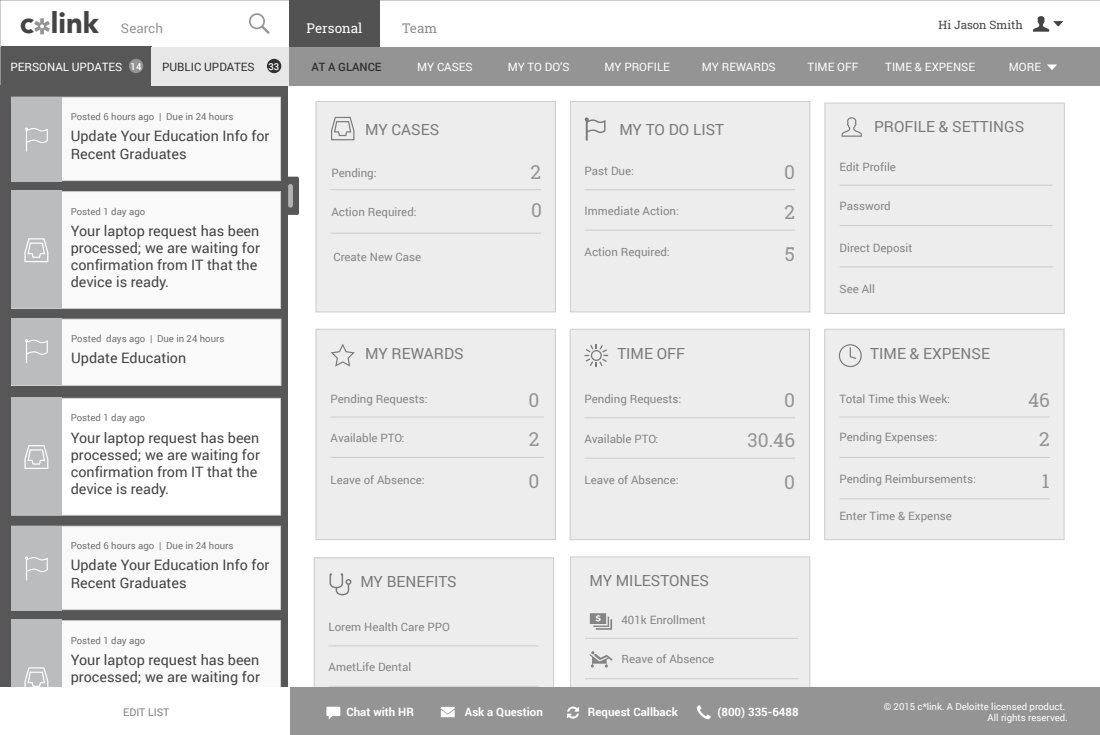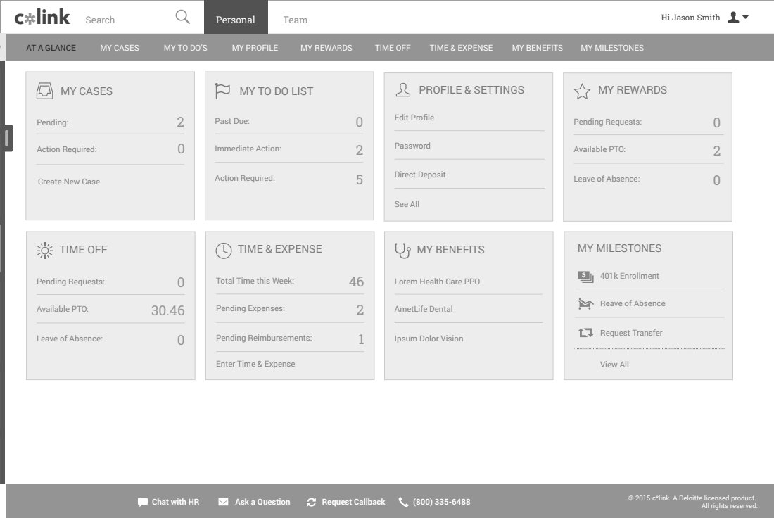 With our requirements coming from the HR Transformation practice at Deloitte, we drew up sketches, designed wireframes, high fidelity designs, and usability tested the designs.